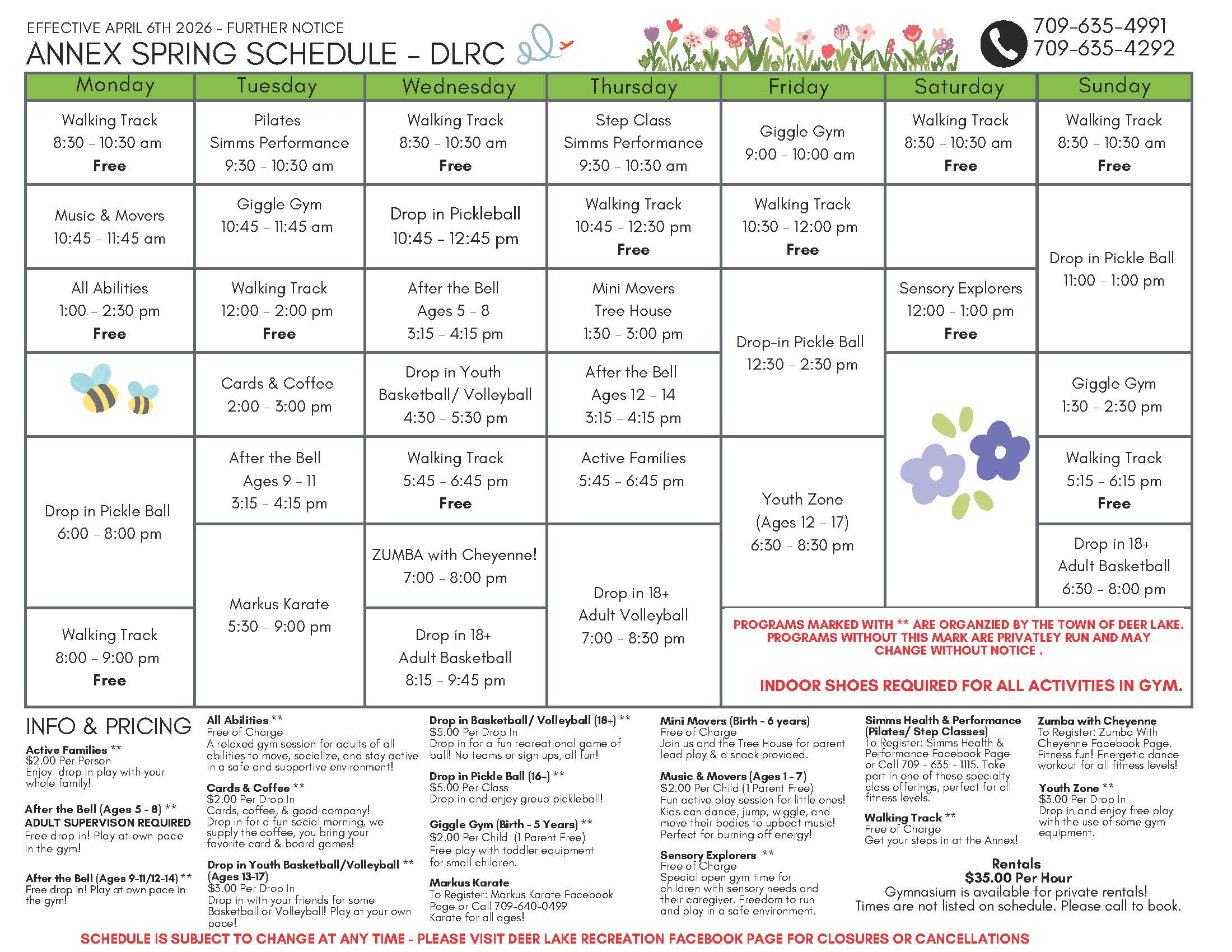 Our schedule is designed to accommodate everyone’s needs. Be sure to check out our current schedule for available swim times and activities. We look forward to welcoming you to the Deer Lake Swimming Pool!
